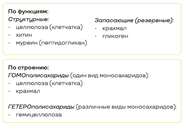 Крахмал имеет две структуры: амилозу с длинными не разветвленными цепями и амилопектин с разветвленными цепями. Полисахариды можно обнаружить с помощью качественных реакций: йод с крахмалом даёт синее окрашивание, а с гликогеном — красно-бурое.
