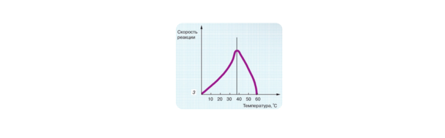 - зависимость от температуры: с повышением температуры скорость реакции возрастает, но после определенного значения (температурного оптимума*) скорость будет снижаться, так как фермент денатурирует, то есть сворачивается и полностью разрушается.
