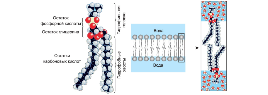 • состоят из гидрофильной головки (остатка глицерина и остатка фосфорной кислоты) и двух гидрофобных хвостов (двух остатков высших жирных кислот);