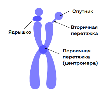 Некоторые хромосомы (спутничные) на коротком плече содержат вторичную перетяжку, которая отделяет особый участок – спутник. В области вторичных перетяжек некоторых хромосом располагаются ядрышковые организаторы – участки ДНК, содержащие информацию о структуре рРНК. В этой области расположено ядрышко*