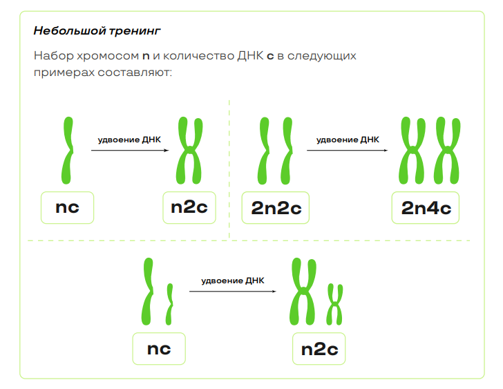 • Поэтому перед делением во время самоудвоения ДНК набор хромосом n не меняется, но изменяется количество ДНК c.