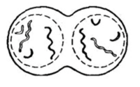 • Восстановление ядерной оболочки и формирование ядрышка (т.е. происходит формирование четырех гаплоидных ядер, в каждое из которых попадают однохроматидные хромосомы, НЕ имеющие гомологичной пары)