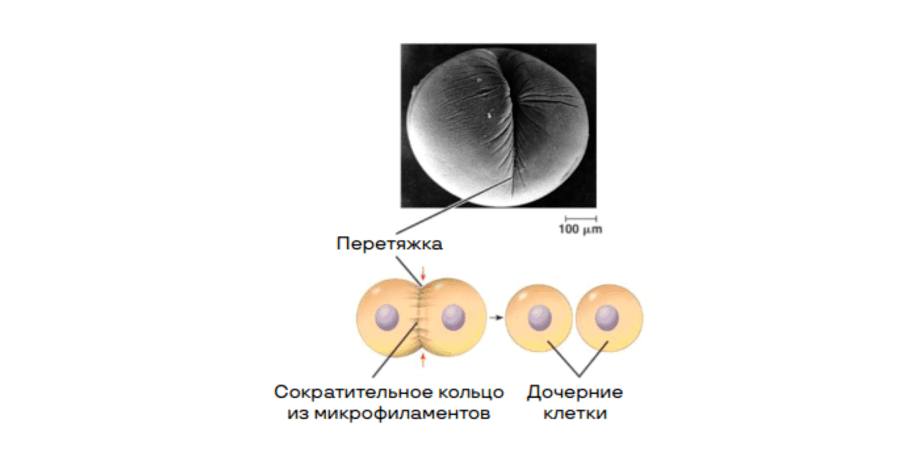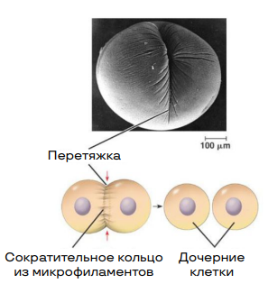 В экваториальной плоскости возникает перетяжка (борозда дробления/ деления). На цитоплазматической поверхности борозды находится сжимающееся (сократительное) кольцо, состоящее из актиновых и миозиновых нитей. Сокращение разделительного (сократительного /контрактильного) кольца микрофиламентов похоже на затягивание шнурка. Разделительная борозда углубляется до тех пор, пока не происходит разделения двух дочерних клеток.