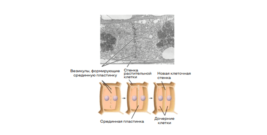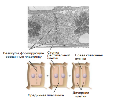 Растения не могут так делиться, так как имеют жесткую клеточную стенку. У них нити веретена деления исчезают не полностью, а сохраняются в экваториальной зоне. Здесь за счёт содержимого пузырьков аппарата Гольджи формируется клеточная (срединная) пластинка, которая разрастаясь, сливается со стенками исходной клетки и разделяет материнскую клетку на две дочерние.