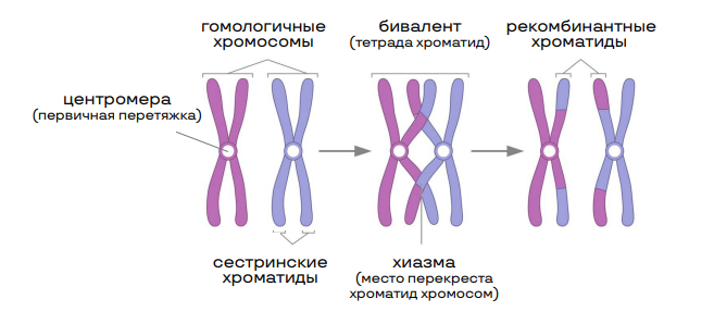 *Кроссинговер – возможный перекрест гомологичных хромосом и обмен их участками. Самая сложная и продолжительная фаза мейоза (занимает около 90% всего времени деления). Стоит помнить, что кроссинговер происходит НЕ ВСЕГДА, поэтому в заданиях с рисунком его могут не отобразить.