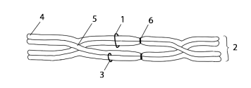 1 – двухроматидная хромосома 2 – бивалент (пара гомологичных хромосом/тетрада хроматид) 3 – хроматида 4 – теломера (концевой участок хроматиды) 5 – хиазма (место перекреста хроматид) 6 – центромера (первичная перетяжка)