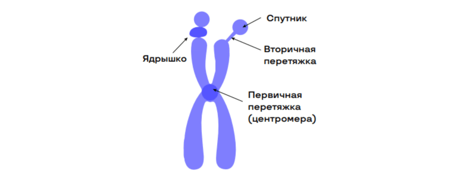 Некоторые хромосомы (спутничные) на коротком плече содержат вторичную перетяжку, которая отделяет особый участок – спутник. В области вторичных перетяжек некоторых хромосом располагаются ядрышковые организаторы – участки ДНК, содержащие информацию о структуре рРНК. В этой области расположено ядрышко*.