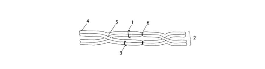 1 – двухроматидная хромосома 2 – бивалент (пара гомологичных хромосом/тетрада хроматид) 3 – хроматида 4 – теломера (концевой участок хроматиды) 5 – хиазма (место перекреста хроматид) 6 – центромера (первичная перетяжка).