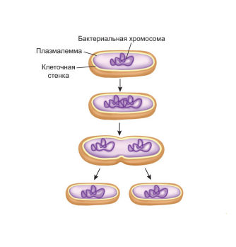• бактерии не способны к митозу, т.к. не имеют ядра (а при митозе происходит кариокинез – деление ядра), поэтому они делятся очень быстро путем простого бинарного деления клетки пополам – генетический материал дублируется (= ДНК реплицируется) и распределяется между двумя дочерними клетками)