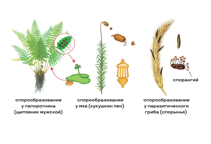 • у растений и некоторых видов грибов (мукор) споры образуются в специальных органах — спорангиях