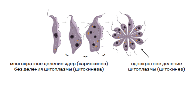 • способ бесполого размножения, во время которого ядро материнской особи делится несколько раз подряд без деления цитоплазмы (цитокинеза) , а затем (после образования определенного количества ядер) образовавшаяся многоядерная клетка распадается на множество одноядерных клеток