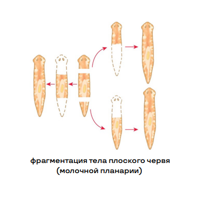 • характерно для беспозвоночных (плоских червей, кишечнополостных, морских звезд) и для растений (размножение некоторых водорослей частями слоевища (таллома))
