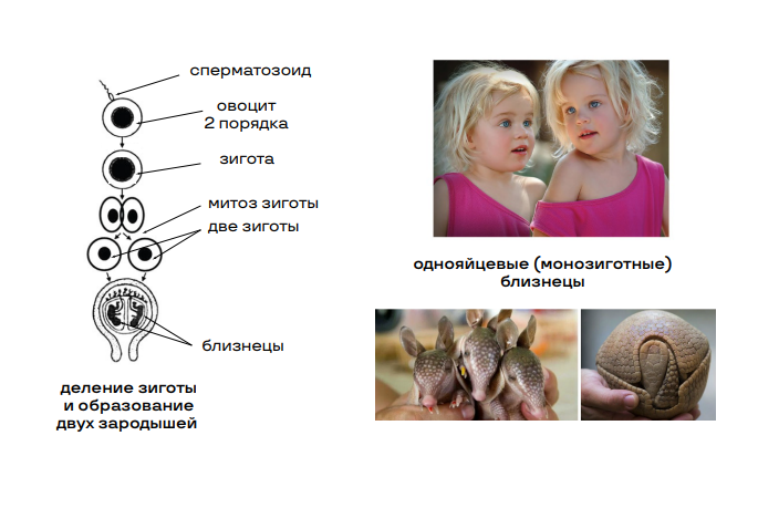 • встречается у многих животных, в том числе и у человека (является причиной появления однояйцевых (монозиготных) близнецов – «близняшек»)