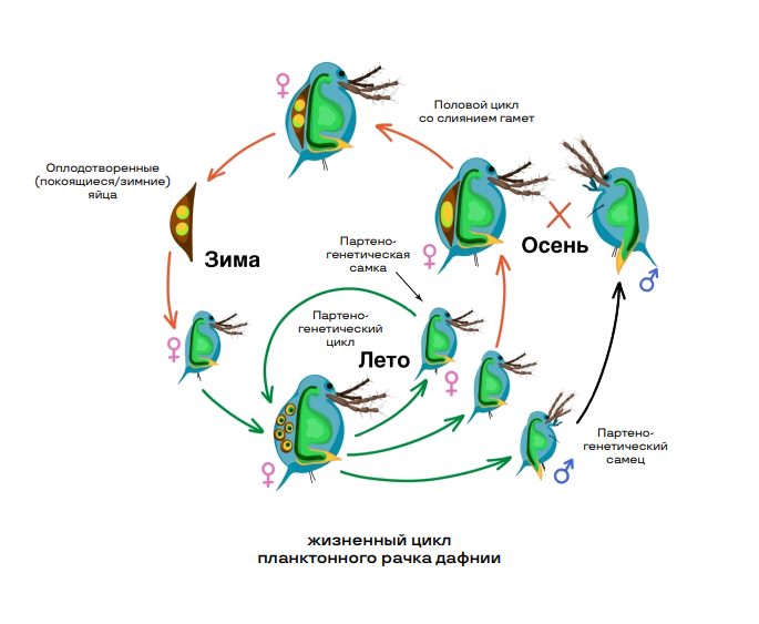 • Например, у дафний в благоприятных условиях диплоидные яйцеклетки развиваются без оплодотворения (=путем партеногенеза) и дают начало диплоидным самкам, которые вновь образуют диплоидные яйцеклетки, замыкая партеногенетический цикл. При снижении температуры водоемов и укорочении длины светового дня появляются гаплоидные самцы. Популяция переходит к половому размножению путем слияния гамет.