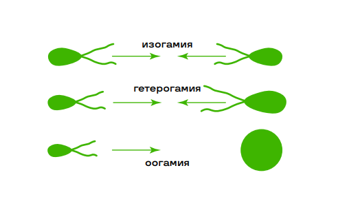 - Анизогамия (гетерогамия) — морфологически (одна крупнее другой) и физиологически разные подвижные гаметы (имеют жгутик)