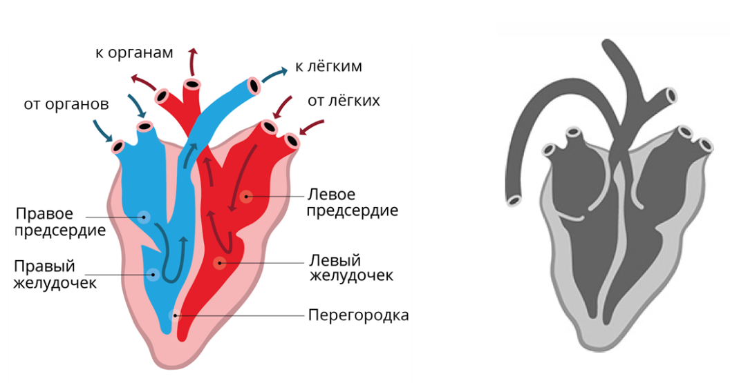 - Кровеносная система: четырехкамерное сердце (два предсердия и два желудочка), правая дуга аорта.