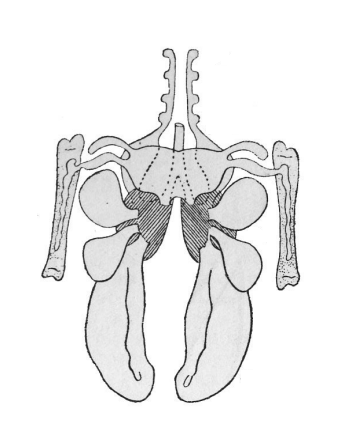 - — наличие сложного крестца (сросшиеся поясничные, крестцовые, часть грудных и хвостовых позвонков)