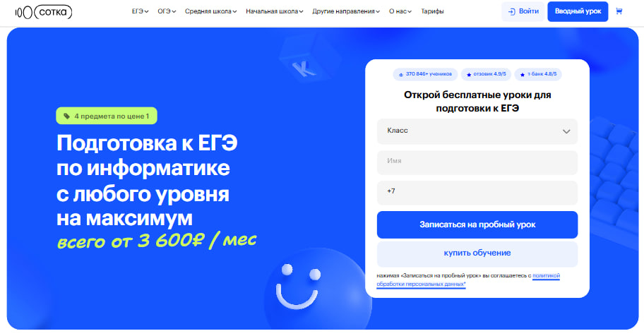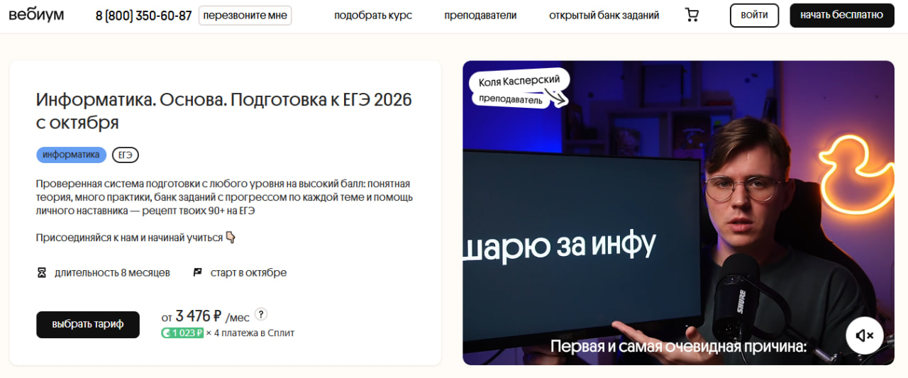 В «Школково» обещают довести ученика до 90+ баллов, начиная с нуля. Формат подготовки — вебинары с разбором всей теории, работа только с актуальными заданиями ЕГЭ, мастер-классы и симуляции экзамена для снятия стресса. Большой упор делают на лайфхаки и критерии проверки, чтобы ученик знал, как отвечать «на максимум». Преподает направление Владимир Николаевич — эксперт ЕГЭ по информатике, автор популярного YouTube-канала и 100-балльник, что добавляет доверия к курсу.