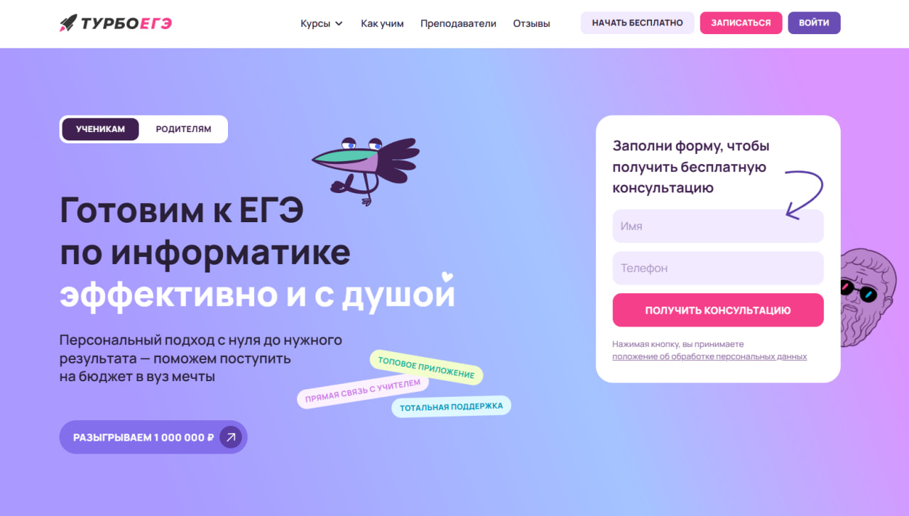 Эта школа делает ставку на личный бренд преподавателя. Камиль Шакиров — стобалльник по информатике, за 7 лет подготовил более 800 учеников, среди которых есть и выпускники со 100 баллами. Обучение идет на собственной платформе: расписание, материалы, пробники и домашние задания собраны в одном личном кабинете. Ученикам обещают индивидуальный план подготовки, сопровождение помощников и активное комьюнити, чтобы процесс не превращался в скучную зубрежку.