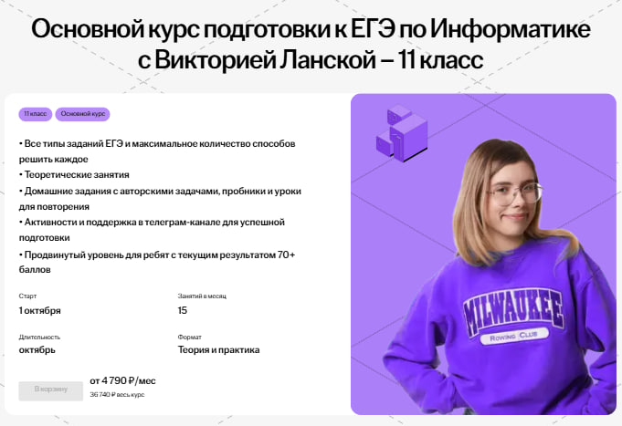 Курс от Умскул рассчитан на учеников 11 класса и стартует 7 сентября. Он подходит для ребят с уровнем от 70+ баллов и нацелен на продвинутую подготовку. Формат включает 13 занятий в месяц, где теория сочетается с практикой: вебинары, домашние задания с авторскими задачами, пробники и повторение ключевых тем. Ученики получают поддержку в телеграм-канале и доступ к платформе с тренажером и системой геймификации.