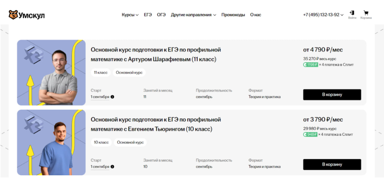 На данный момент времени популярным курсом по профильной математике считается годовой курс и курс по базовой математике.