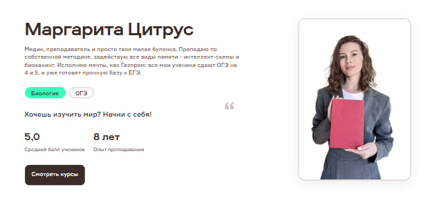 Маргарита Цитрус — уникальный преподаватель, обладающий глубокими медицинскими знаниями и уникальным подходом к обучению. Она окончила Академию биологии и биотехнологий Южного федерального университета с отличием и сама показала блестящие результаты, сдав ЕГЭ по биологии на 96 баллов. Уже более восьми лет Маргарита занимается подготовкой школьников к ОГЭ, доказывая свою высокую квалификацию и умение передать знания.