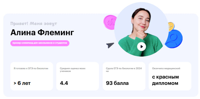 Призёр олимпиад, выпускница медвуза с красным дипломом. Сдала ЕГЭ по биологии на 93 балла, в преподавании уже 6 лет. Средняя оценка её учеников по ОГЭ — 4,4. Алина делает упор на объяснение через реальные примеры из медицины и жизни.