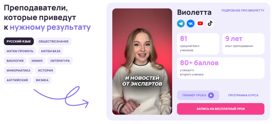Виолетта | Турбо ЕГЭ | 8 лет | 4 360 ₽ | 81балл (2024 год) | Живая подача с юмором, строгий контроль темпа |