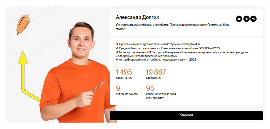 Автор Всероссийского пробника, сторонник концепции «Грамотным быть модно» и человек, чей курс по русскому одобрен самим министром просвещения — это все про Александра Долгих. Он работает с 2016 года, сдал ЕГЭ на 95 баллов и готовит по собственной программе, одобренной экспертами.