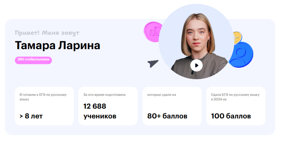 Тамара Ларина | Сотка | 7 лет | 7 110 ₽ | 80+ | Глубокое объяснение, индивидуальный подход |