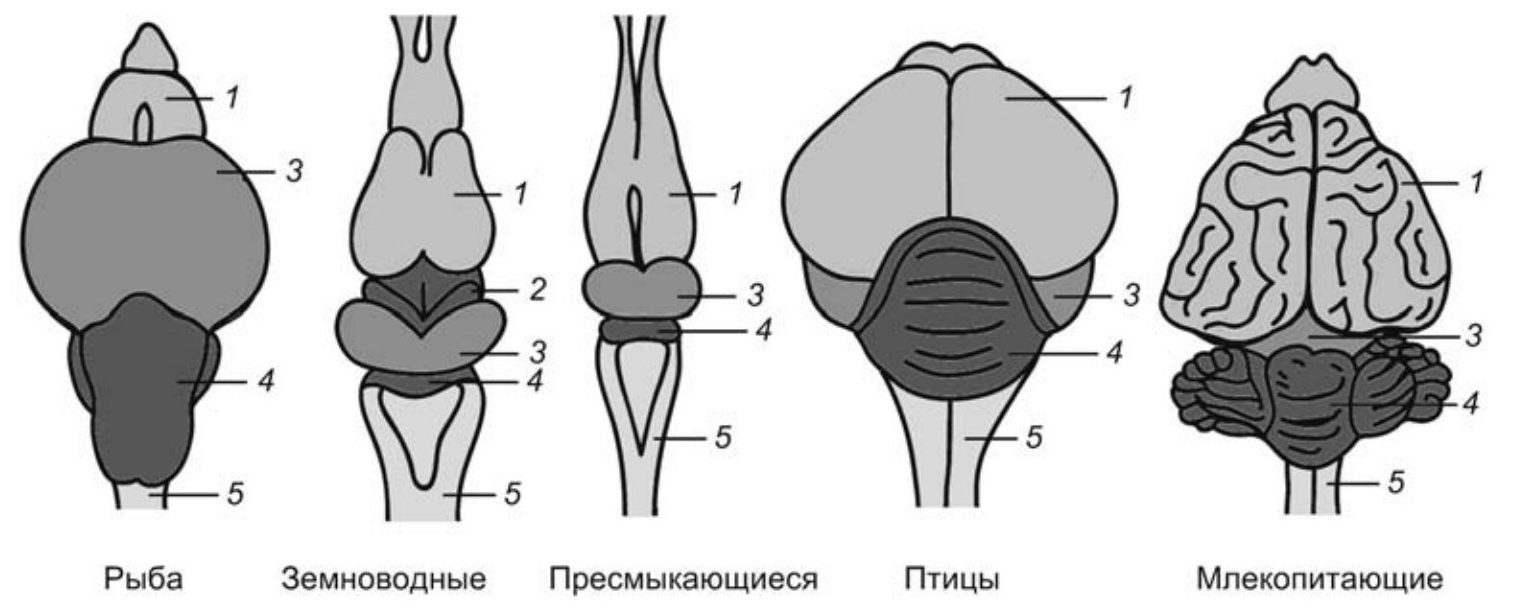 У рыб наиболее развиты средний мозг (3) и мозжечок (4).