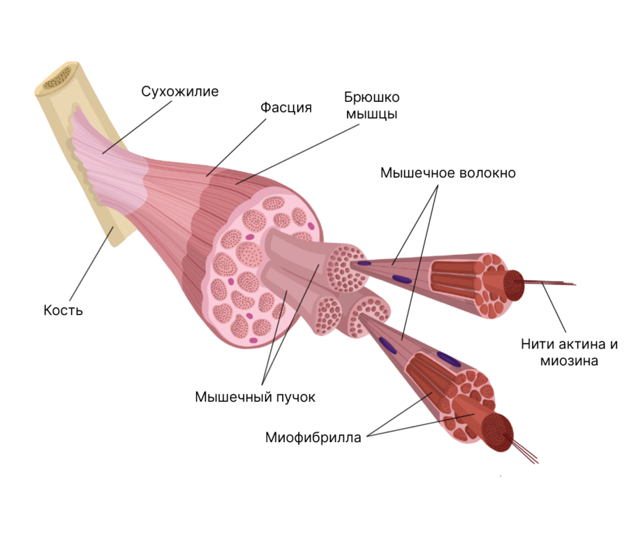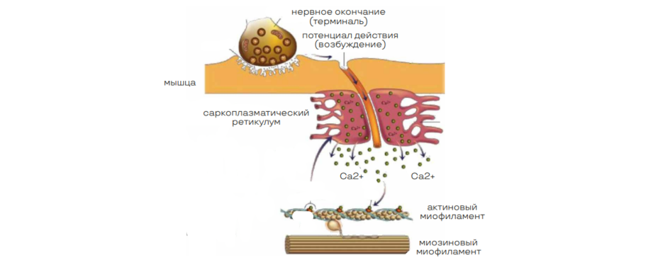 1. Нервный импульс стимулирует деполяризацию (возбуждение) мембраны мышечных клеток, что приводит к высвобождению ионов кальция из ЭПС (саркоплазматического ретикулума);