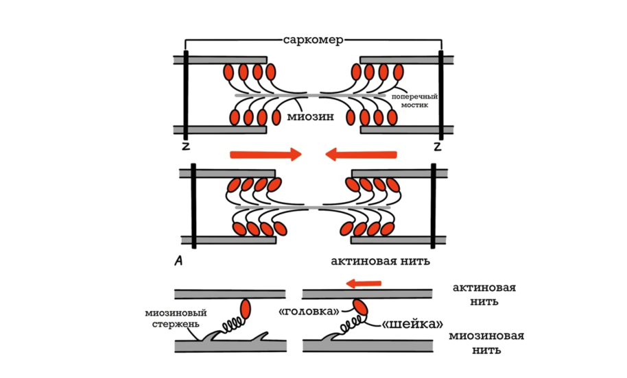 3. За счет расщепления АТФ включается актин-миозиновый комплекс, нити (филаменты) актина «скользят» между филаментами миозина - мышца сокращается;