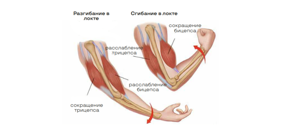 Пример: При сгибании руки в локте бицепс (двуглавая мышца) плеча сокращается, а трицепс (трехглавая мышца) плеча в это время расслабляется (и наоборот).