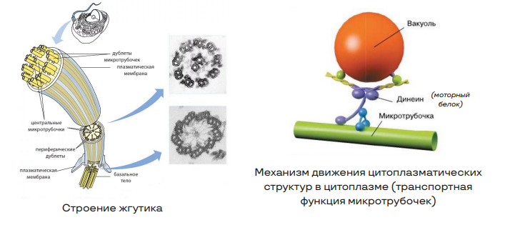 • участвуют в образовании органоидов движения – ресничек и жгутиков (у эукариот, у прокариот жгутики состоят из белка - флагеллина); веретена деления и центриолей центросомы (клеточного центра), базальных телец.