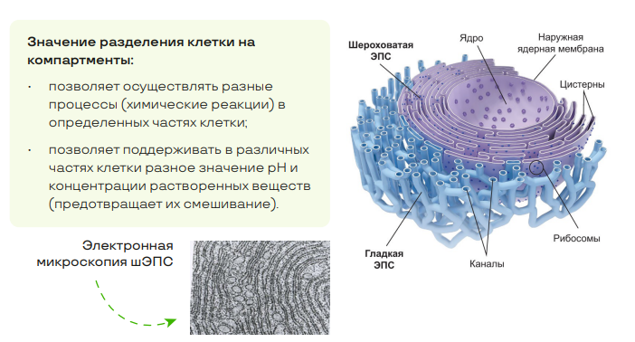 • Делит клетку на компартменты (функциональные части/отсеки) – компартментализация* клетки;