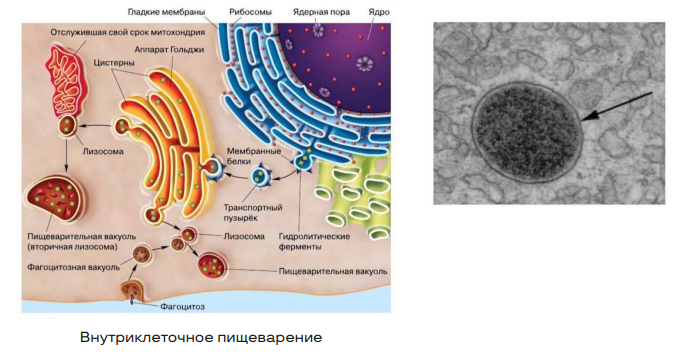 • Бывают первичные (только образовавшиеся в АГ), вторичные (пищеварительная вакуоль = лизосома + фагосома) и третичные (телолизосомы/остаточные тельца – содержат непереваренные остатки веществ).