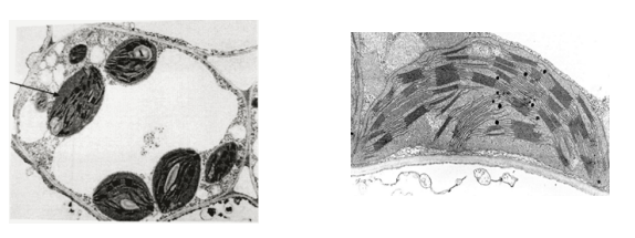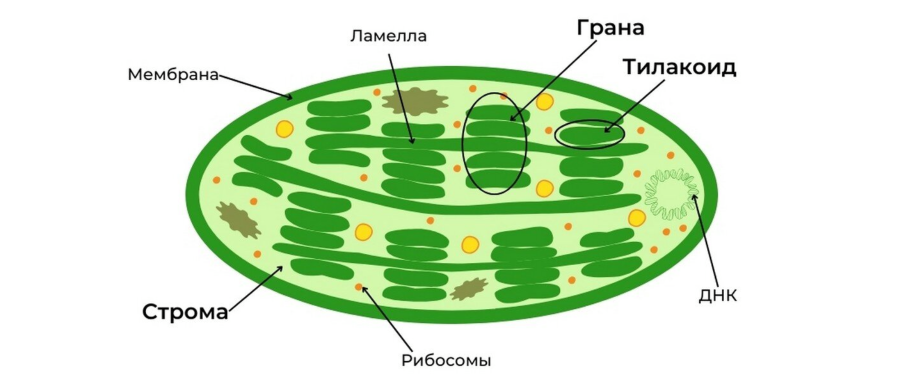 • Есть внутренние мембранные структуры, увеличивающие площадь рабочей поверхности — тилакоиды (одномембранные мешочки), граны (стопки тилакоидов), все это соединено ламеллами (длинными трубками);