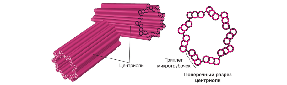 • Каждая центриоль состоит из 9-ти комплексов микротрубочек, а каждый комплекс микротрубочек состоит из 3-х микротрубочек соответственно (9 триплетов микротрубочек);