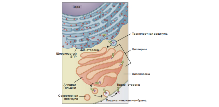 На ЭПС происходит синтез молекул (белковых, так как изображен гранулярный ретикулум) Белковые молекулы в составе транспортной везикулы (пузырька) направляется к цис-полюсу аппарата Гольджи Белки, поступившие в комплекс Гольджи, модифицируются и перемещаются по цистернам к противоположному полюсу транс-полюсу, обращенному к цитоплазматической мембране.