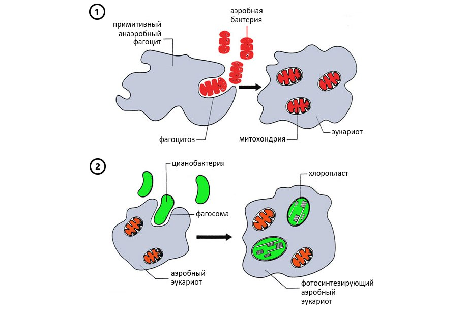 Митохондрии и хлоропласты были некогда свободноживущими прокариотами, наподобие бактерий. Эти прокариоты, случайно проникнув в клетку-хозяина, вступили с ней во взаимовыгодные отношения — симбиоз, то есть не переварились и впоследствии стали двумембранными органоидами. Причём митохондрии оказались внедрены во все клетки эукариот, а хлоропласты — только в растительные клетки.
