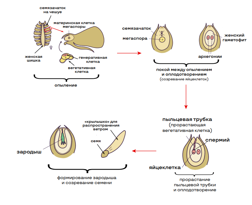 • Пыльца (пыльцевые зерна (n)) с помощью ветра попадает в женские шишки, где улавливается густой жидкостью между интегументом и нуцеллусом, выступающей из микропиле и попадает внутрь семязачатка (т.е. происходит опыление);