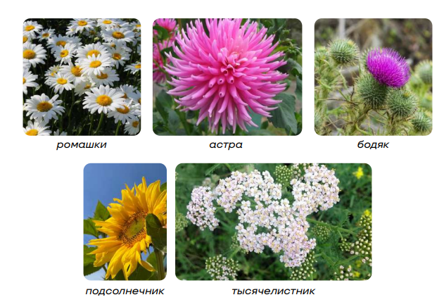 Примеры: астра, георгин, подсолнух, ромашка, бодяк, пижма, козлобородник, мать-и-мачеха, цикорий, топинамбур, чертополох.