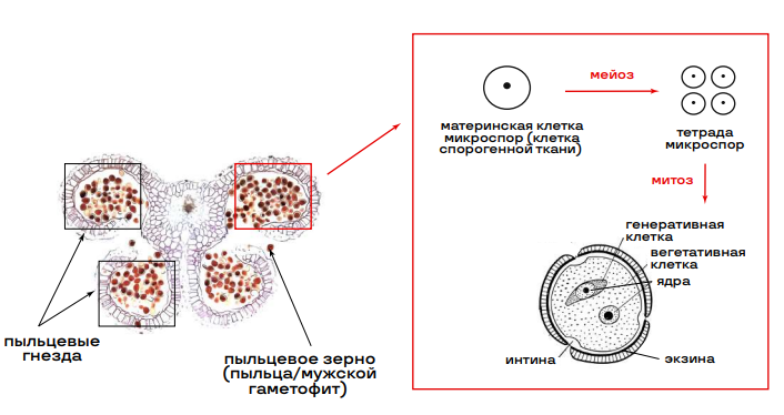 Процесс образования микроспор (микроспорогенез) и мужского гаметофита.