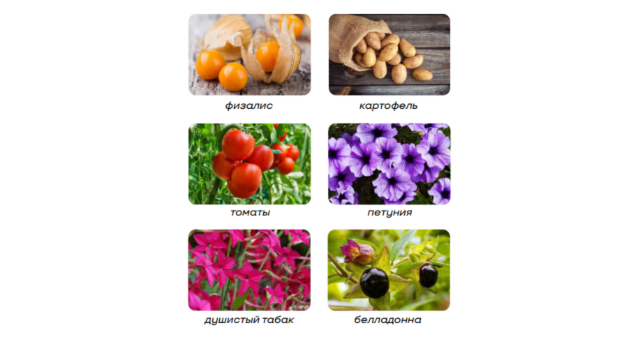 Примеры: картофель, томат, табак, дурман, паслен, перец, баклажан, петуния, белена, белладонна, физалис.