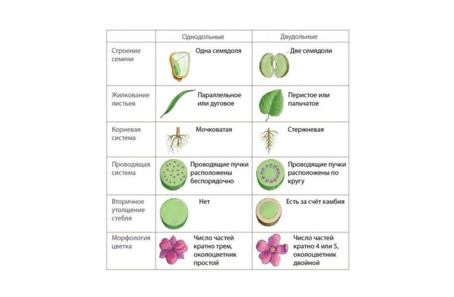 Покрытосеменные растения делят на два класса: Двудольные и Однодольные.