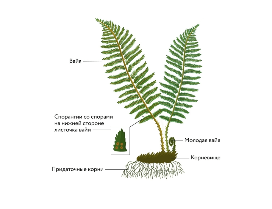 • У большинства папоротников листья выполняют функции фотосинтеза и спороношения, у некоторых видов – часть листьев только фотосинтезирует (трофофиллы), а другая часть листьев служит для развития спорангиев (спорофиллы) – органов со спорами;