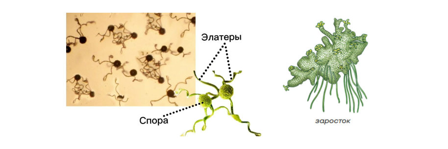 Заросток – зеленая многократно ветвящаяся пластинка. Споры с элатерами (пружинками) – гигроскопическими (способными поглощать влагу) спирально закрученными ленточными структурами. В дождливую погоду при повышенной влажности они закручиваются вокруг споры, а в сухую – раскручиваются, способствуя тем самым распространению спор.