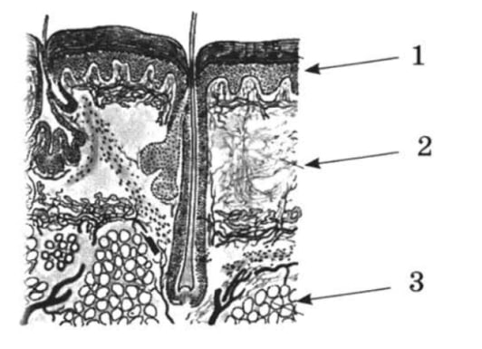 Какие структуры кожи человека обозначены цифрами 1, 2, 3? Какими типами тканей они образованы? Какие функции выполняет структура, обозначенная цифрой 1?