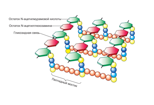 Параллельно расположенные полисахаридные цепи сшиваются друг с другом короткими пептидными мостиками между остатками N-ацетилмурамовой кислоты. Действие многих антибактериальных средств основано на разрушении структуры муреина или подавлении его синтеза. Например, лизоцим (фермент слюны) расщепляет гликозидные связи между остатками N-ацетилглюкозамина и N-ацетилмурамовой кислоты, что в итоге вызывает гибель бактерий.